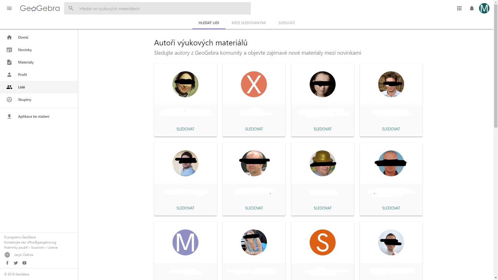 Sekce lidé nabízí přehled uživatelů, kteří přispívají svými materiály do světa GeoGebry. Zde si volíte, koho chcete sledovat, podívat se na jeho profil a případně i na materiály, které vytvořil a sdílel veřejně. Zároveň jsou zde karty, na kterých se můžete podívat na sledované lidi a také na ty, kteří sledují Vás.