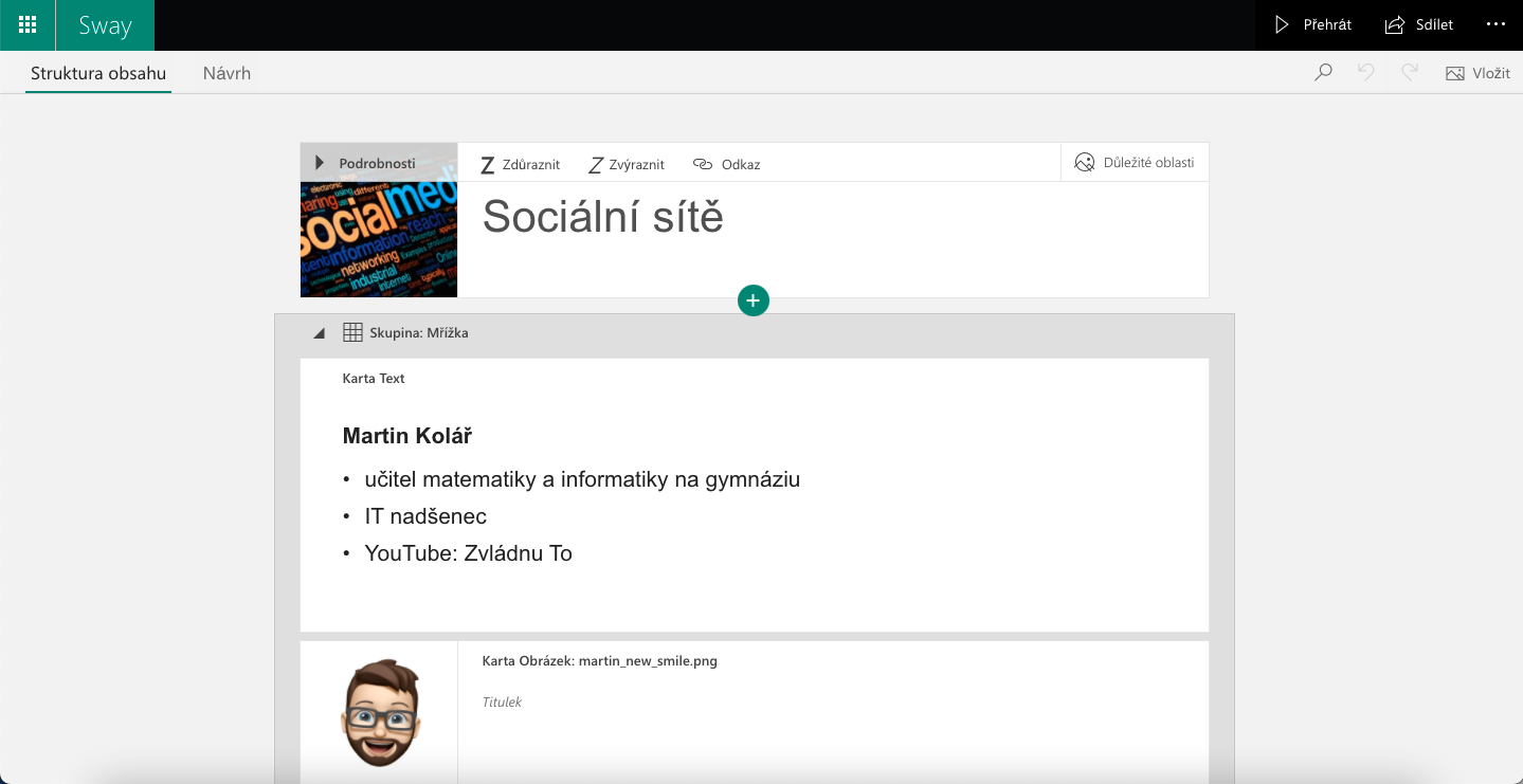 V Microsoft Sway pracujeme s dvěma módy (pokud to tak můžeme nazvat) – v jednom přidáváme prvky do prezentace a volíme design – Prostor nápadů (dříve pojmenováno jako Struktura obsahu), v druhém vidíme, jak prezentace ve skutečnosti vypadá – Návrh. Tedy při přidávání jednotlivých prvků nevidíme výsledek, ale stačí si překliknout na tlačítko návrh a výsledek vidíme.